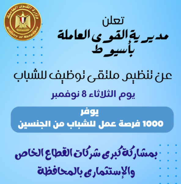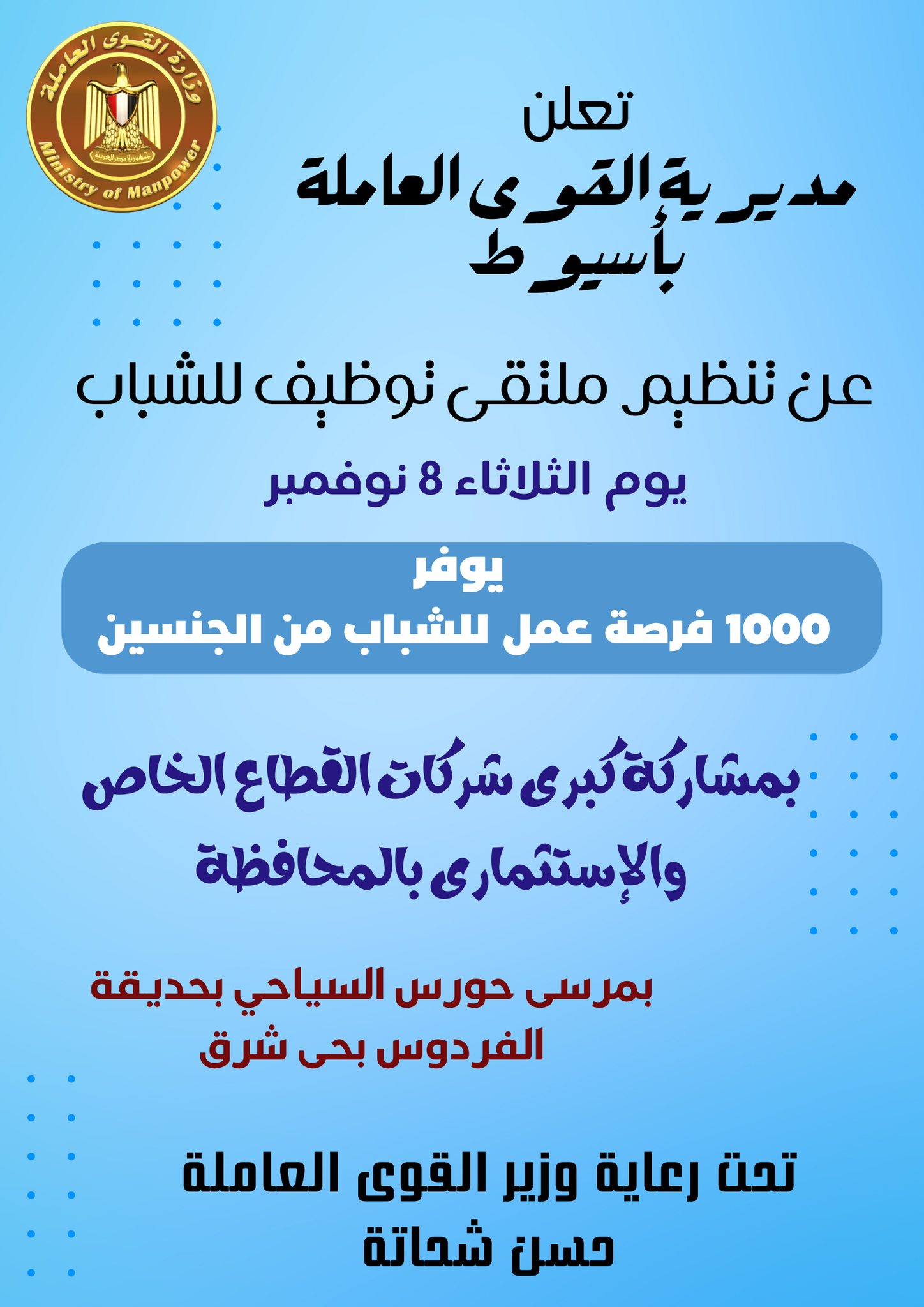 أعلنت مديرية القوى العاملة بمحافظة أسيوط عن تنظيم ملتقى توظيفي بالمحافظة، الثلاثاء المقبل 8 نوفمبر ، من الساعة 9 صباحًا حتي الساعة 3 مساءًا بمرسى حورس السياحي بحديقة الفردوس بحى شرق ، يوفر أكثر من 1000 فرصة عمل للشباب من الجنسين بمشاركة العديد من كبرى شركات القطاع الخاص ، وذلك تحت رعاية وزير القوى العاملة حسن شحاتة ، و اللواء عصام إبراهيم محافظ أسيوط .