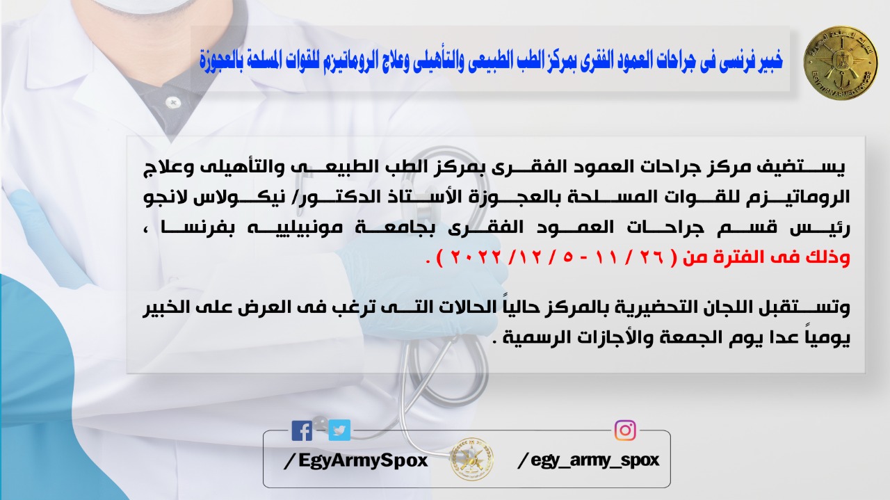 خبير فرنسى فى جراحات العمود الفقرى بمركز الطب الطبيعى والتأهيلى وعلاج الروماتيزم للقوات المسلحة بالعجوزة