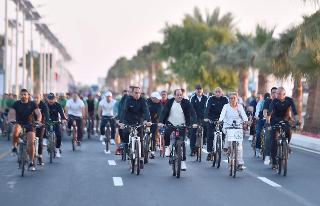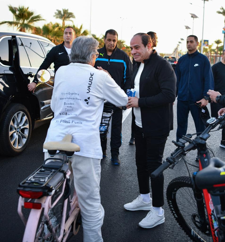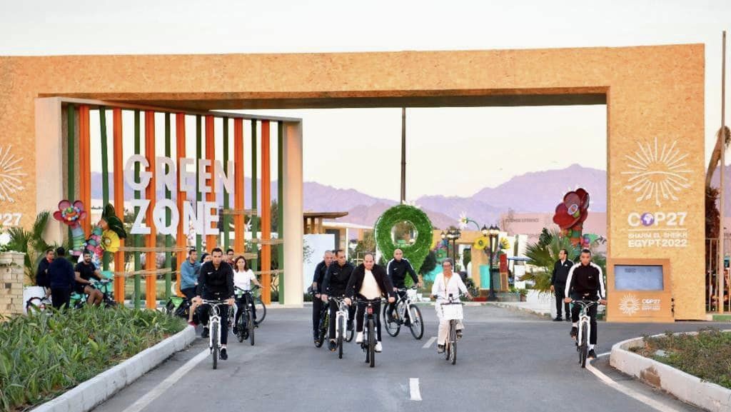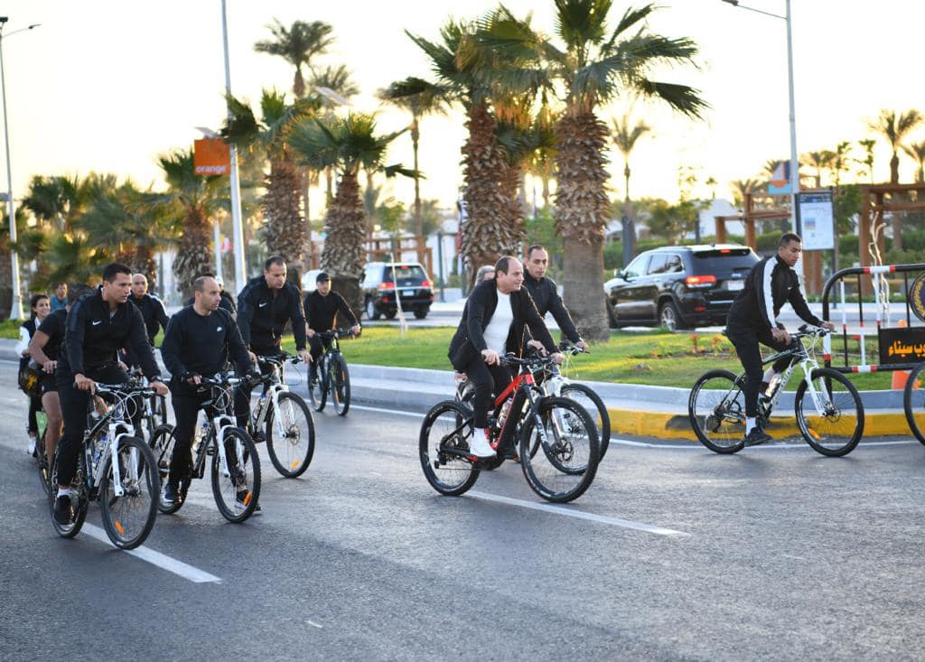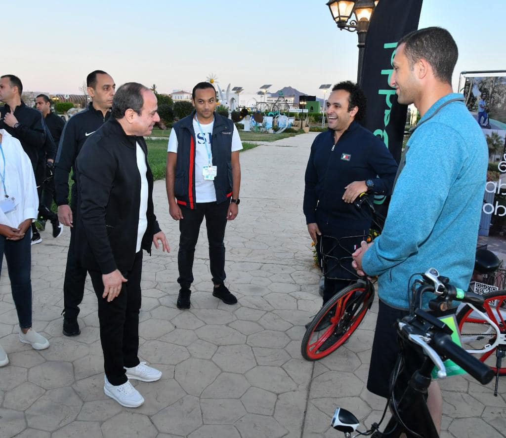 قام السيد الرئيس عبد الفتاح السيسي بجولة تفقدية فجر اليوم بالدراجة فى مدينة شرم الشيخ، تفقد خلالها المنطقة الخضراء الصديقة للبيئة والتى تشهد العديد من الفعاليات والأنشطة خلال انعقاد القمة العالمية للمناخ، كما التقى سيادته بعدد من الشباب والاجانب المشاركين فى القمة.