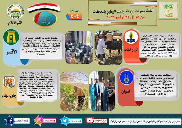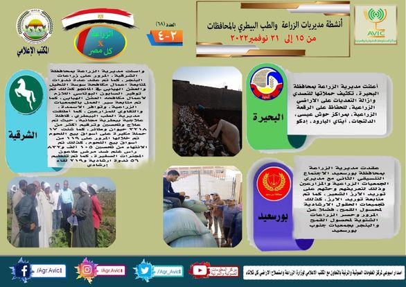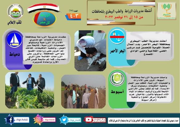 أصدر مركز المعلومات الصوتية والمرئية التابع لوزارة الزراعة واستصلاح الأراضي، والمكتب الاعلامي للوزارة، العدد رقم ٦٨ من اصدار: "الزراعة في كل مصر" بالانفوجراف والفيديو، يوضح الجهود والانشطة التي تقوم بها مديريات الزراعة والطب البيطري بمحافظات الجمهورية خلال الفترة من ١٥ الى ٢١ نوفمبر الجاري.