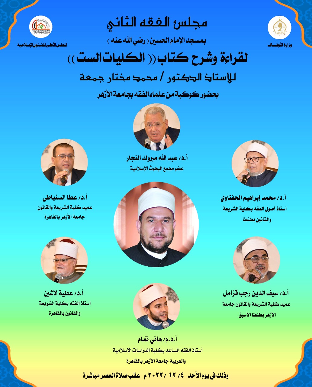 في إطار الدور الريادي الذي تقوم به وزارة الأوقاف المصرية في نشر الفكر الوسطي وتصحيح المفاهيم الخاطئة، وخاصة فيما يتعلق بالفقه والفتوى، ينطلق مجلس الفقه الثاني بمسجد الإمام الحسين (رضى الله عنه) لقراءة وشرح كتاب "الكليات الست" للأستاذ الدكتور/ محمد مختار جمعة وزير الاوقاف وذلك يوم الأحد ٤ / ١٢ / ٢٠٢٢م ، عقب صلاة العصر مباشرة بحضور كوكبة من علماء الفقه بجامعة الأزهر، وهم : وأ.د/ عبد الله مبروك النجار عضو مجمع البحوث الإسلامية ، وأ.د/ سيف الدين رجب قزامل عميد كلية الشريعة والقانون جامعة الأزهر بطنطا الأسبق، وأ.د/ محمد إبراهيم الحفناوي أستاذ أصول الفقه بكلية الشريعة والقانون بطنطا، وأ.د/ عطا السنباطي عميد كلية الشريعة والقانون جامعة الأزهر بالقاهرة، وأ.د/ عطية لاشين أستاذ الفقه بكلية الشريعة والقانون بالقاهرة، وأ.د.م/ هاني تمام أستاذ الفقه المساعد بكلية الدراسات الإسلامية والعربية جامعة الأزهر بالقاهرة، هذا وقد تناول مجلس الفقه الأول كتاب "قواعد الفقه الكلية".