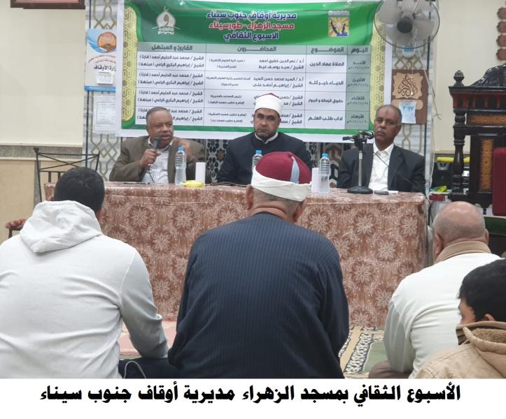 ففي مديرية أوقاف جنوب سيناء أقيم الأسبوع الثقافي بمسجد الزهراء التابع لإدارة طور سيناء، حاضر فيه أ.د/ نصر الدين خضري عميد كلية العلوم الأزهرية بجنوب سيناء، والشيخ/ السيد يوسف غيط مدير مديرية أوقاف جنوب سيناء، وقدم له الأستاذ/ محمود عيسى كبير الإذاعيين بإذاعة جنوب سيناء، والقارئ الشيخ/ محمد عبد الحليم أحمد قارئا، والمبتهل الشيخ/ إبراهيم البكري الراعي مبتهلًا، بحضور جمع غفير من رواد المسجد.