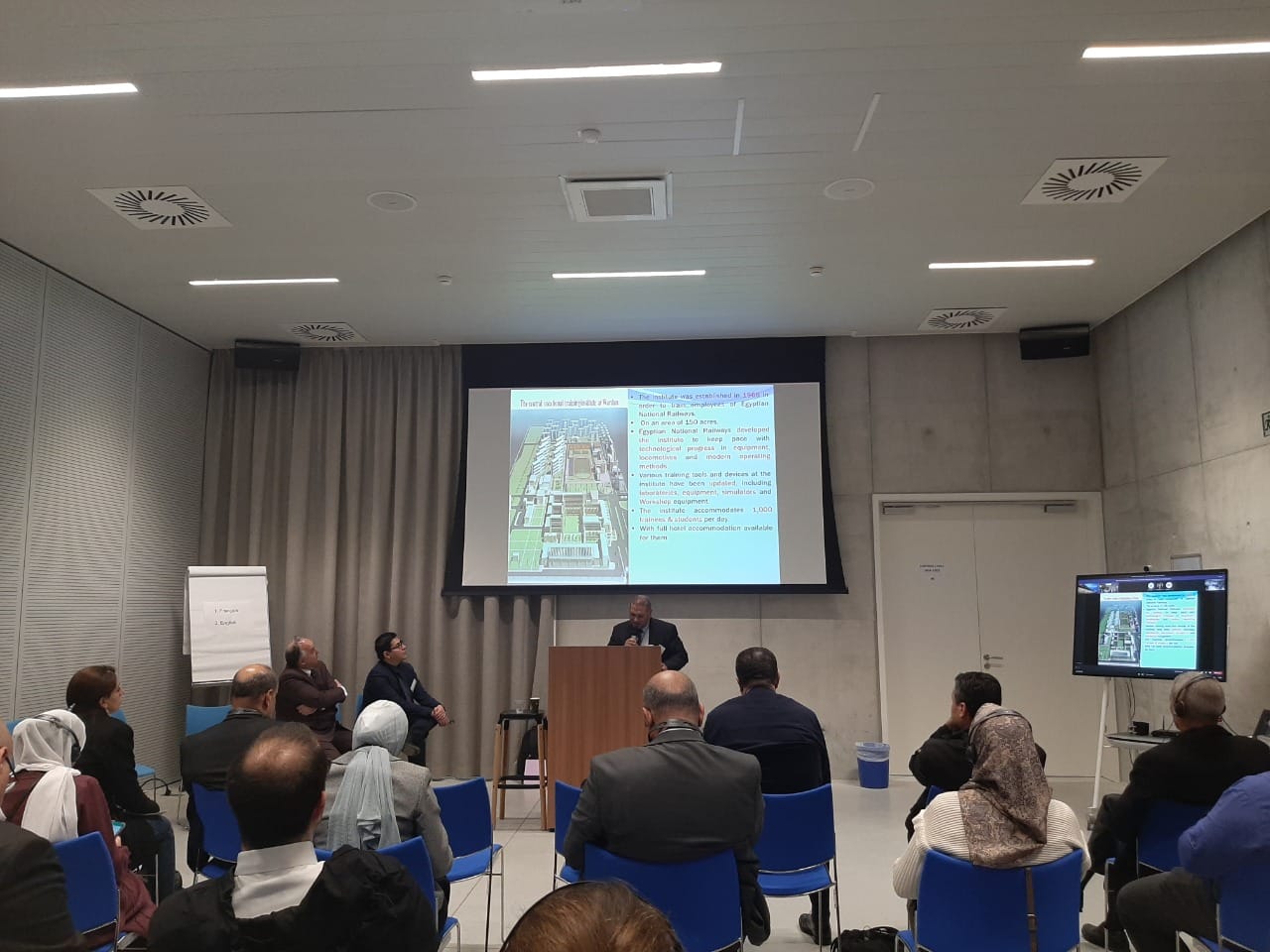 وألقى السيد الدكتور / محمد حسين عبدالعزيز - نائب رئيس مجلس الإدارة الكلمة الخاصة بالوفد المصرى أوضح فيها الإجراءات التى تقوم بها الهيئة القومية لسكك حديد مصر والتى من شأنها تطوير العنصر البشرى ورفع كفاءة العلمية والعملية التدريبية لتحقيق أعلى معدلات السلامة ليواكب ما تقوم به الهيئة حالياً من تحديث وتطوير بكافة قطاعاتها ، وأيضا عمل شراكة مع كبرى الشركات التى تعمل بالمجال السككى مثل ألستوم الفرنسية وتاليس الأسبانية وسيمنز وDB الألمانيتين وأيضا أكاديمية السويدى .