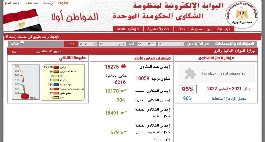 وأضاف سيادته أن مؤشر إنجاز الشكاوى بوزارة الموارد المائية والرى بمنظومة الشكاوى الحكومية الموحدة بمجلس الوزراء أوضح أن نسبة تنفيذ الشكاوى خلال الفترة من يناير ٢٠٢١ حتى نهاية شهر نوفمبر ٢٠٢٢ بلغت (٩٥ %) ، وإنتهت الوزارة من بحث ودراسة عدد (٦٠٥) شكوى وطلب وإستغاثة خلال شهر نوفمبر ٢٠٢٢.