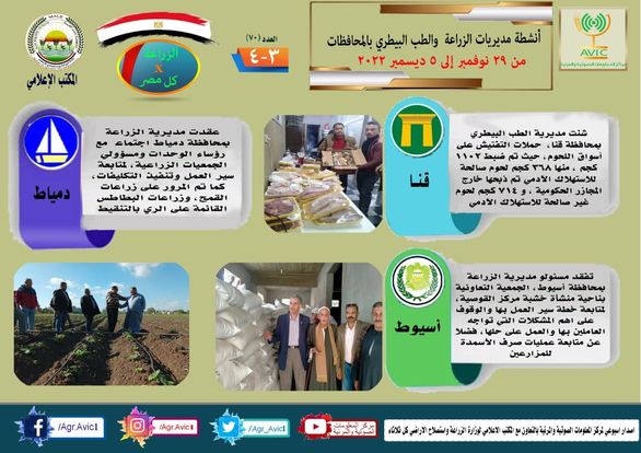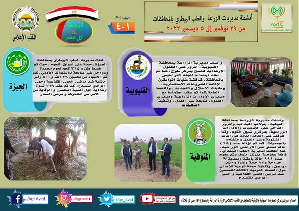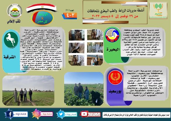 أصدر مركز المعلومات الصوتية والمرئية التابع لوزارة الزراعة واستصلاح الأراضي، والمكتب الاعلامي للوزارة، العدد رقم ٧٠ من اصدار: "الزراعة في كل مصر" بالانفوجراف والفيديو، يوضح الجهود والانشطة التي تقوم بها مديريات الزراعة والطب البيطري بمحافظات الجمهورية خلال الفترة من ٢٩ نوفمبر وحتى ٥ ديسمبر الجاري.