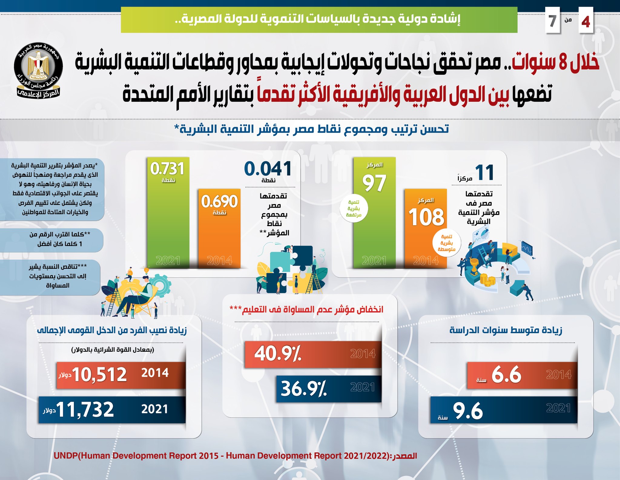وأشار التقرير أيضاً إلى تقدم مصر 0.041 نقطة بمجموع نقاط المؤشر حيث سجلت 0.731 نقطة عام 2021، مقابل 0.690 نقطة عام 2014، علماً بأنه كلما اقترب الرقم من 1 كلما كان أفضل، بالإضافة إلى زيادة متوسط سنوات الدراسة حيث سجلت 9.6 سنة في 2021، مقابل 6.6 سنة في 2014.