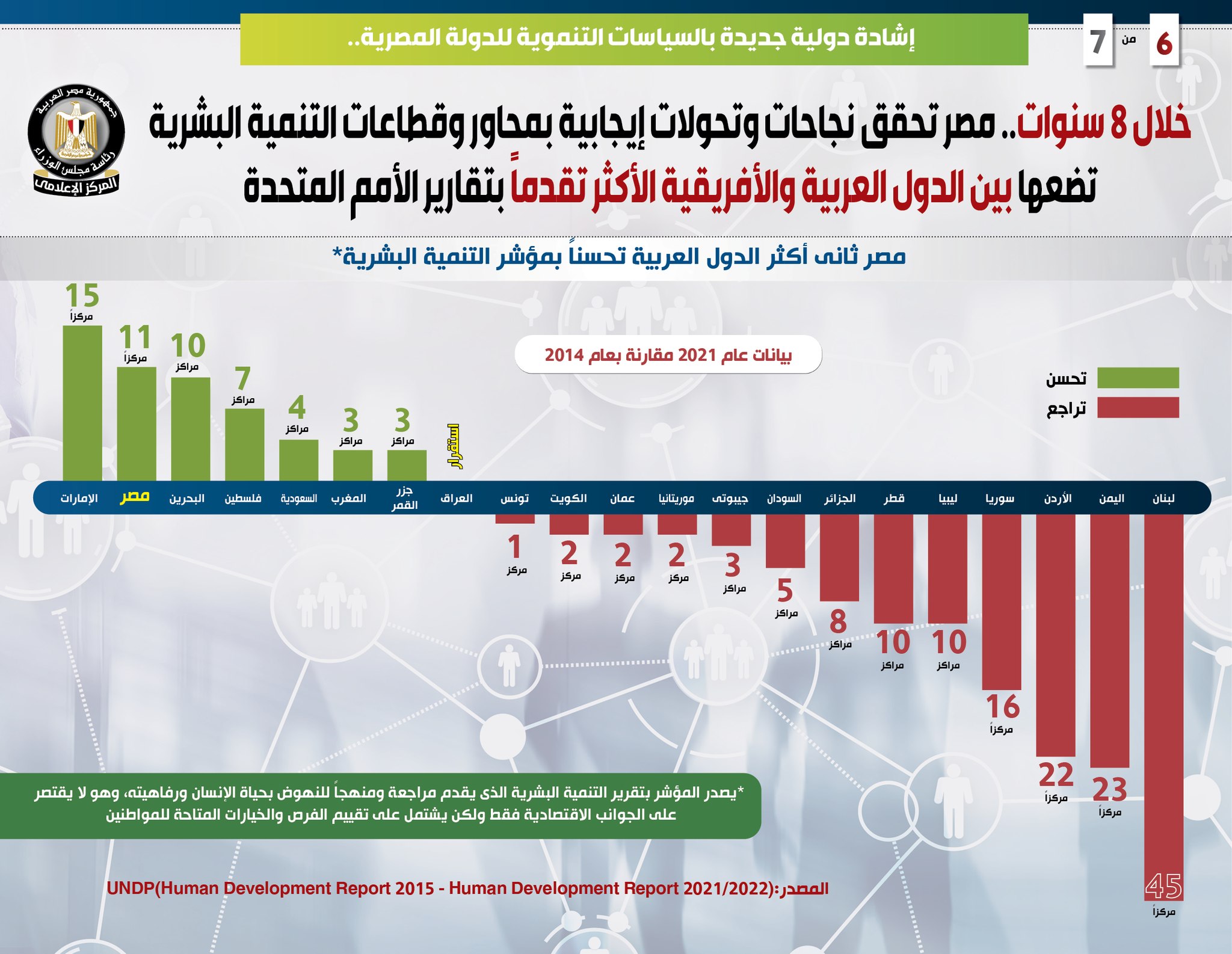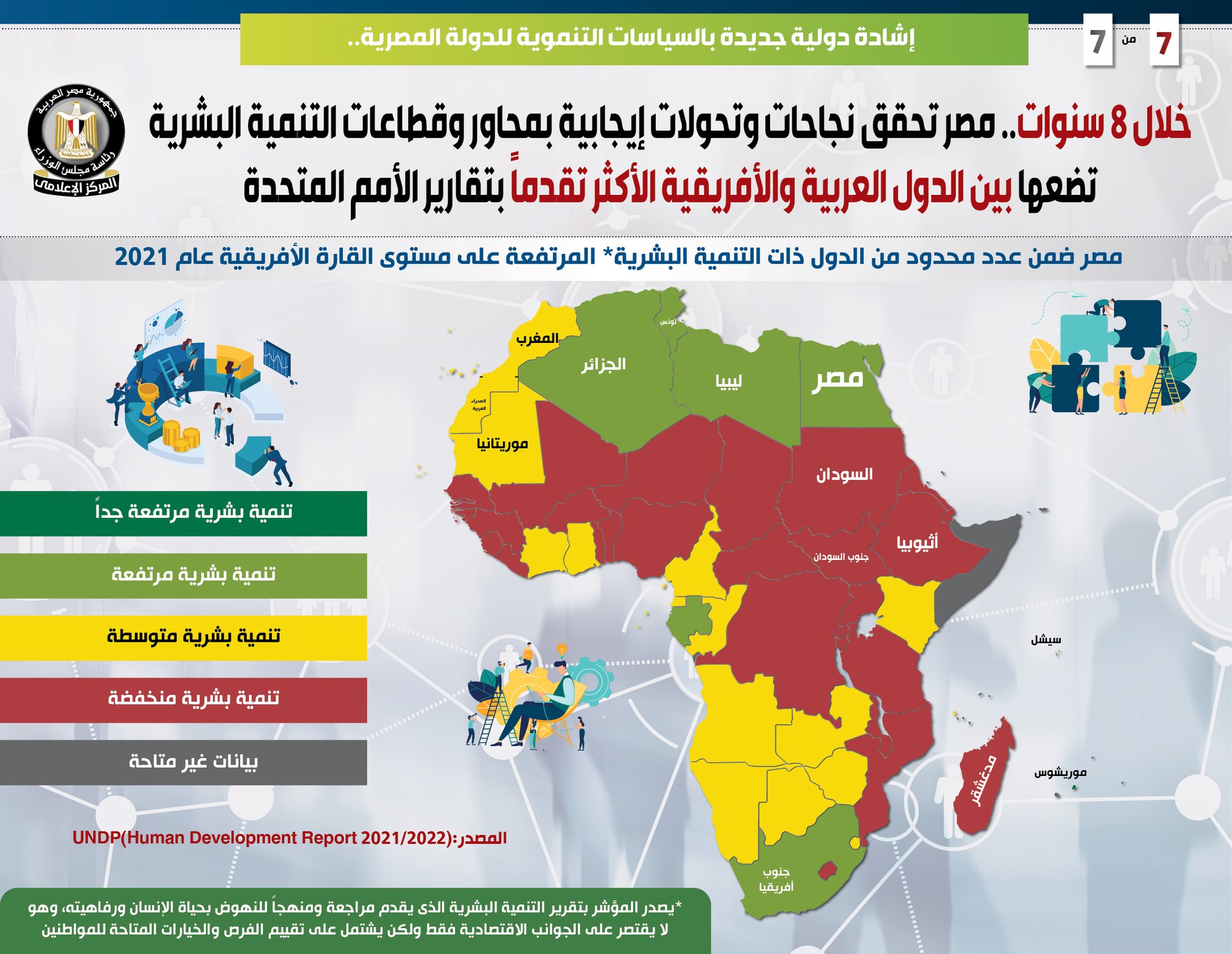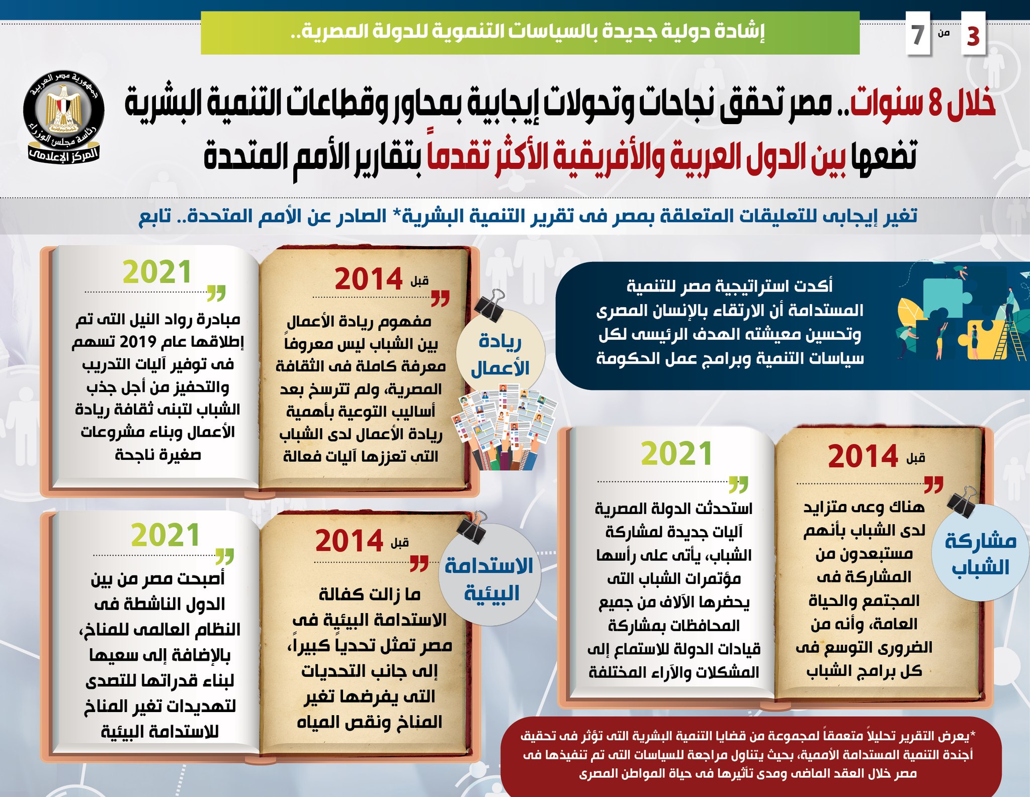 وفي هذا الصدد نشر المركز الإعلامي لمجلس الوزراء تقريراً تضمن إنفوجرافات تسلط الضوء على ما حققته مصر من نجاحات وتحولات إيجابية بمحاور وقطاعات التنمية البشرية خلال 8 سنوات، وضعتها بين الدول العربية والأفريقية الأكثر تقدماً بتقارير التنمية البشرية التي تصدر عن الأمم المتحدة، وهو ما يمثل إشادة دولية جديدة بالسياسات التنموية للدولة المصرية.