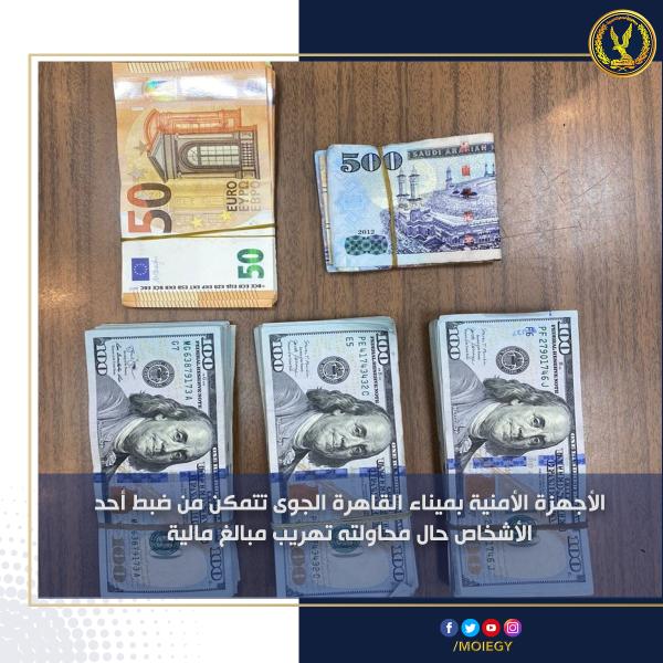 الأجهزة الأمنية بميناء القاهرة الجوى تتمكن من ضبط احد الاشخاص حال تهريب مبالغ مالية