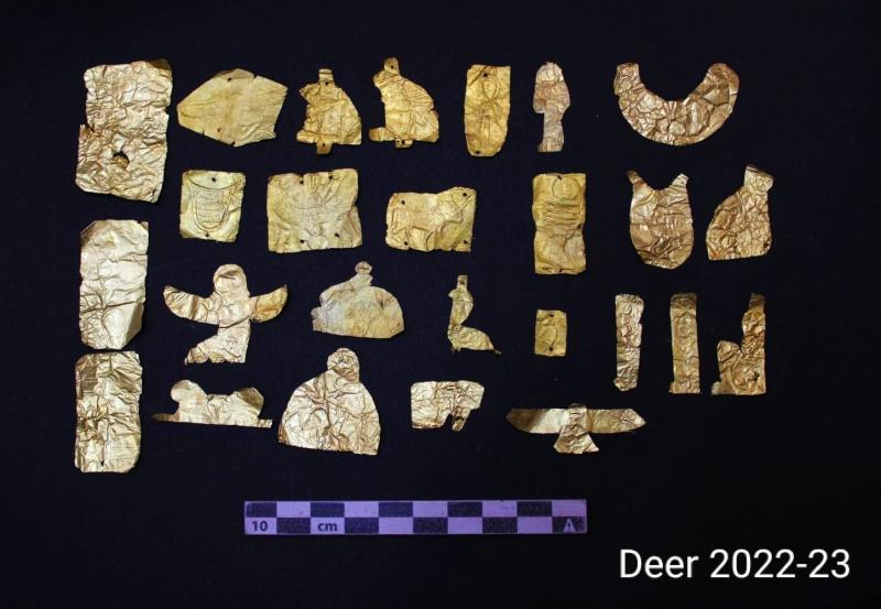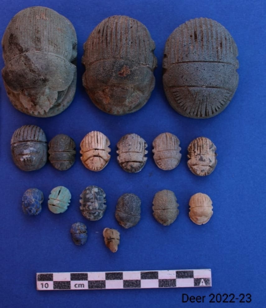وأفاد الأستاذ قطب فوزي رئيس الإدارة المركزية لآثار الوجه البحري وسيناء ورئيس البعثة الأثرية أن البعثة نجحت كذلك في الكشف عن رقائق مذهبة كانت تغطي بقايا دفنات آدمية، تجسد المعبودات ايزيس، وحقات، وباستت، كذلك تجسيد لعين حورس الحامية ( اوجات)، وكذا حورس بهيئة الصقر فارداً جناحيه، بالإضافة إلى العديد من التمائم الجنائزية مختلفة الأشكال والأحجام والأحجار مثل الجعارين، وعمود الجد، ومسند الرأس، وريشتي آمون، والعديد من المعبودات منها ايزيس ونفتيس،وجحوتي، وتاورت.