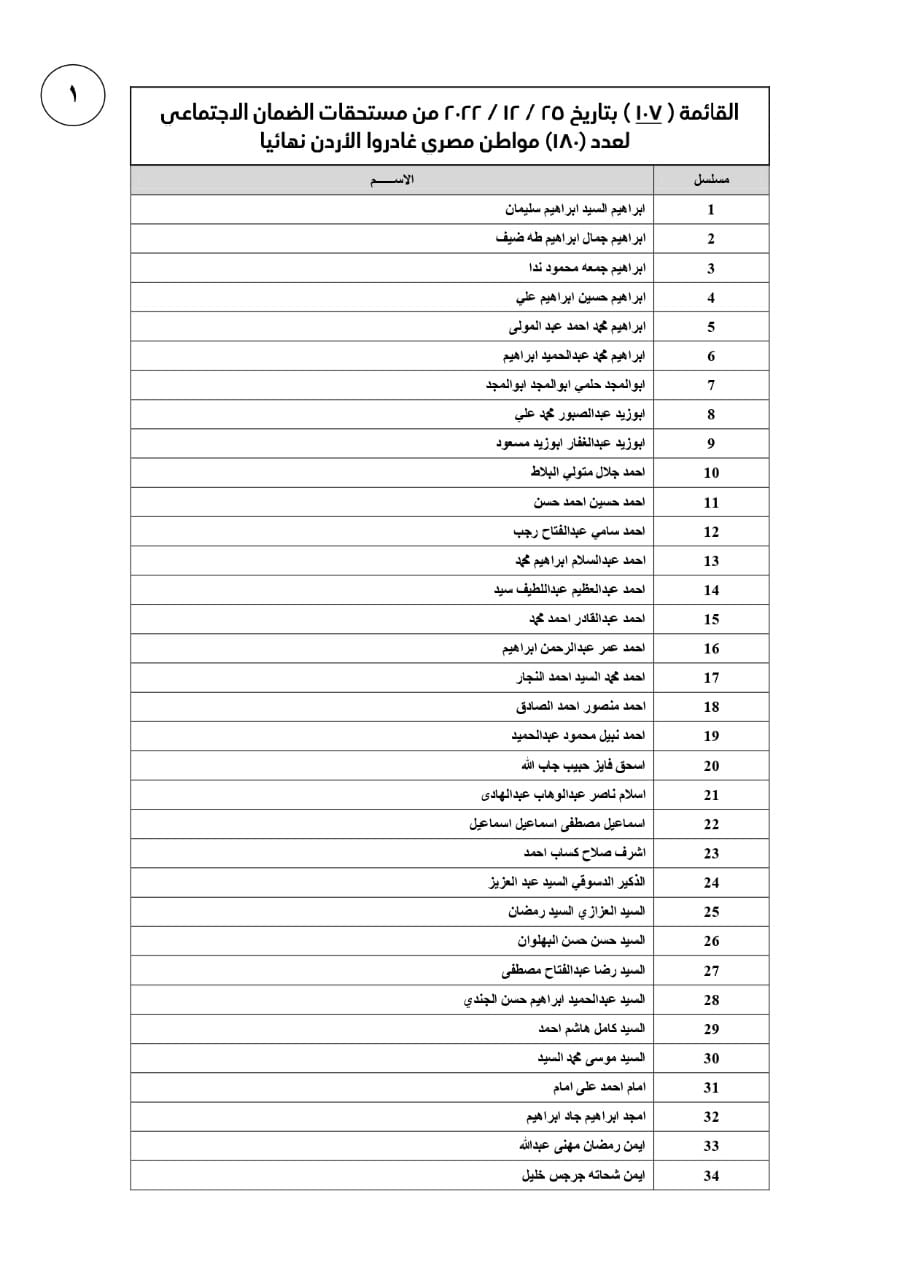 أعلنت وزارة القوى العاملة في بيان لها اليوم الاحد أن مكتب التمثيل العمالي التابع للوزارة بالسفارة المصرية بالعاصمة الأردنية عمان، تابع مع المسئولين بمؤسسة الضمان الاجتماعي بالأردن-استكمالا لما تم تحويله سابقا- عملية تحويل القائمة الـ 107 من مستحقات الضمان الاجتماعي لنحو 180 عامل مصري لدى" المؤسسة" غادروا عمان نهائيا..