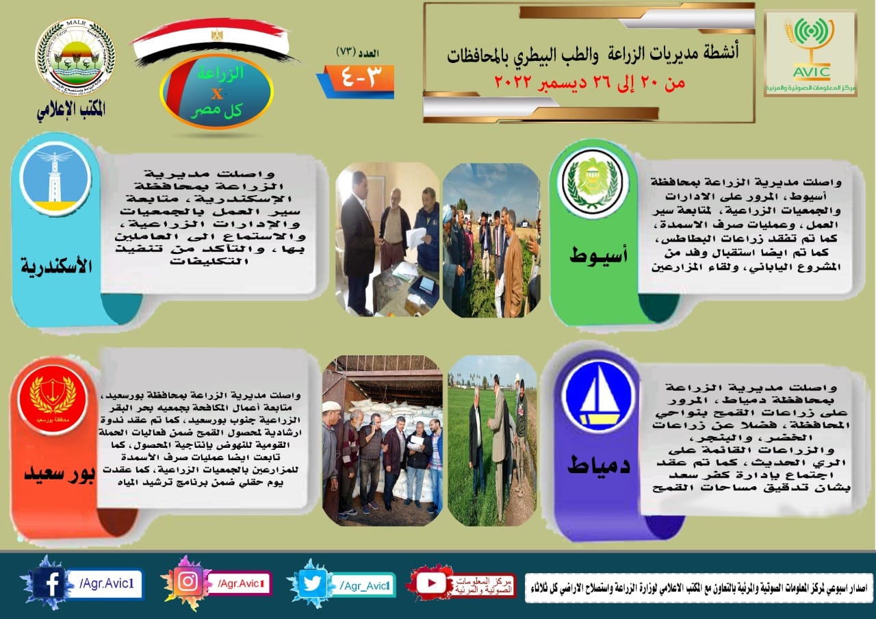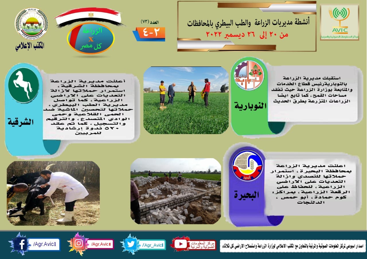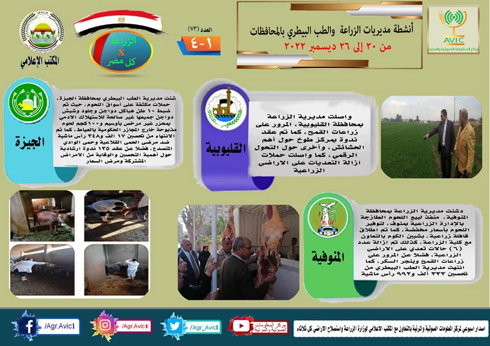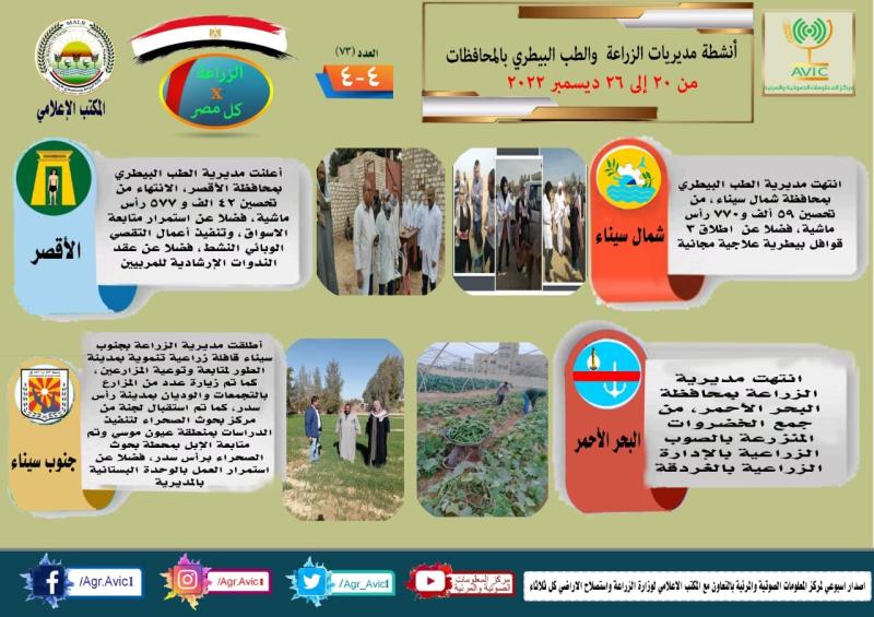 أصدر مركز المعلومات الصوتية والمرئية التابع لوزارة الزراعة واستصلاح الأراضي، والمكتب الاعلامي للوزارة، العدد رقم ٧٣ من اصدار: "الزراعة في كل مصر" بالانفوجراف والفيديو، يوضح الجهود والانشطة التي تقوم بها مديريات الزراعة والطب البيطري بمحافظات الجمهورية خلال الفترة من ٢٠ وحتى ٢٦ ديسمبر الجاري.