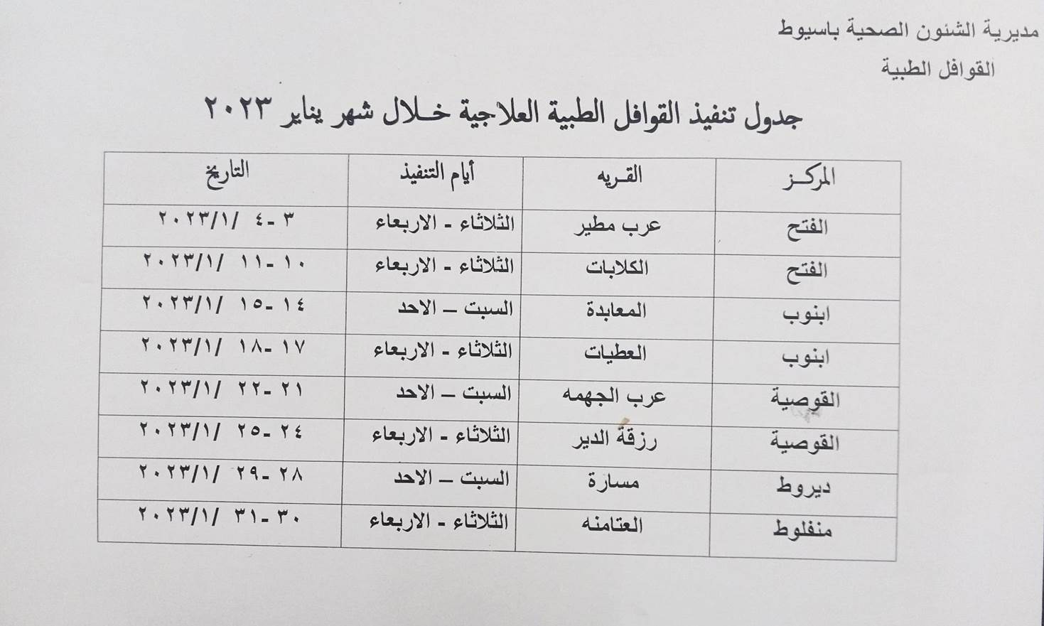وأضاف المحافظ أن القوافل الطبية لشهر يناير تبدأ عملها من يوم 3 إلى 31 يناير ويتم تنفيذها بواقع يومين بكل قرية حيث تبدأ يومي الثلاثاء والأربعاء 3 و4 يناير بقرية عرب مطير بمركز الفتح ثم قرية الكلابات بذات المركز يومي الثلاثاء والأربعاء 10 و11 يناير تنتقل بعدها لقرية المعابدة بمركز أبنوب يومي السبت والأحد يومي 14 و15 يناير ثم قرية العطيات بذات المركز يومي الثلاثاء والأربعاء 17 و18 يناير تم تنتقل القافلة يومي السبت والأحد 21 و22 يناير لقرية عرب الجهمة بمركز القوصية بعدها تتوجه يومي الثلاثاء والأربعاء 24 و25 يناير لقرية رزقة الدير بنفس المركز ثم يومي السبت والأحد يومي 28 و29 يناير بقرية مسارة بمركز ديروط وتنهي القوافل أعمالها يومي الثلاثاء والأربعاء 30 و31 يناير بقرية العتامنة بمركز منفلوط.