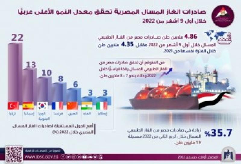 وأوضح المركز- في الإنفوجراف الذي نشره، اليوم الثلاثاء - أن صادرات مصر من الغاز الطبيعي المسال شهدت ارتفاعًا خلال الربع الثاني من 2022 وصل إلى 35.7% مسجلةً 1.9 مليون طن، متوقعًا أن تحقق صادرات مصر من الغاز الطبيعي المسال رقمًا قياسيًّا خلال 2022 وذلك بنحو 7 إلى 8 ملايين طن.