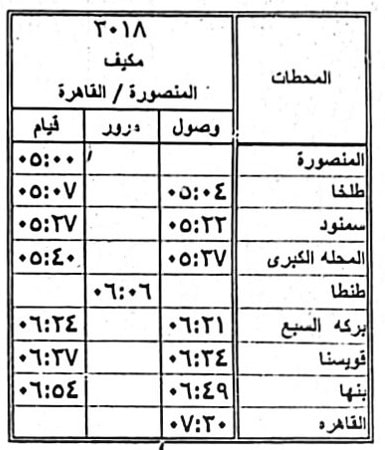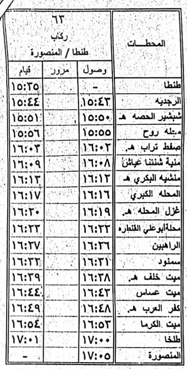 و يترتب على ما سبق تعديل ميعاد قطار 63 ركاب ( طنطا / المنصورة ) حيث يقوم من طنطا الساعة 15:35 بدلاً من الساعة 15:20 ويصل المنصورة الساعة 17:05 بدلاً من الساعة 16:55 كالجدول المرفق .
