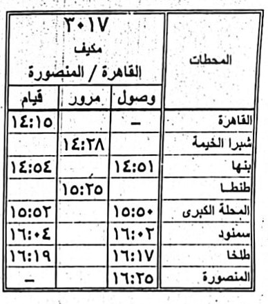 سيتم تشغيل قطار 3017 بعربات درجة ثالثة مكيفة ( القاهرة / المنصورة ) خدمة جديدة حيث يقوم من القاهرة الساعة 14:15 ويصل المنصورة الساعة 16:25 كالجدول المرفق.