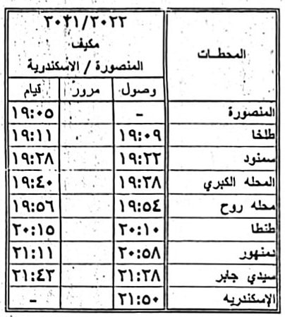 كما يتم تشغيل قطار 3022/3021 بعربات درجة ثالثة مكيفة ( المنصورة / الاسكندرية ) خدمة جديدة حيث يقوم من المنصورة الساعة 19:05 ويصل الاسكندرية الساعة 21:50 كالجدول المرفق .