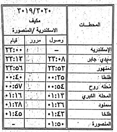 و تشغيل قطار 3020 / 3019 بعربات درجة ثالثة مكيفة ( الاسكندرية / المنصورة) خدمة جديدة حيث يقوم من الاسكندرية الساعة 23:00 ويصل المنصورة الساعة 01:50 فجر اليوم التالى كالجدول المرفق .