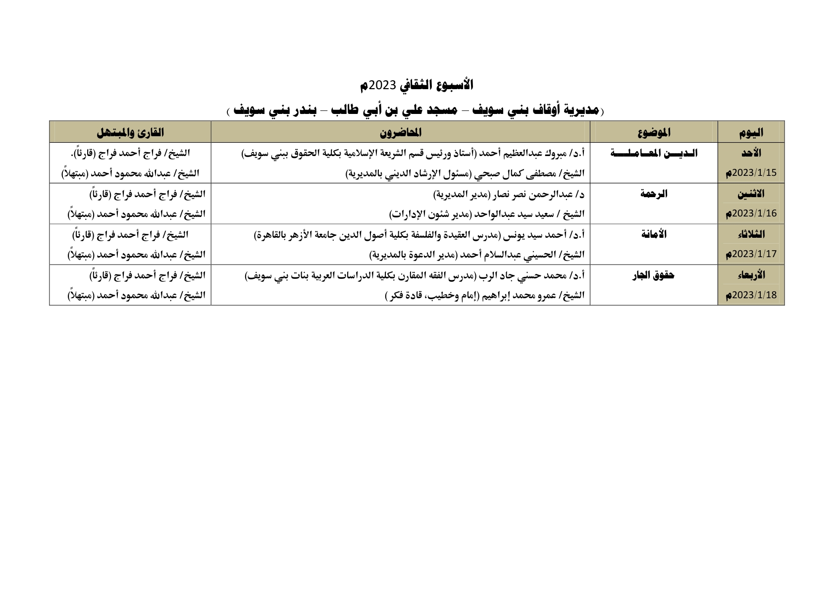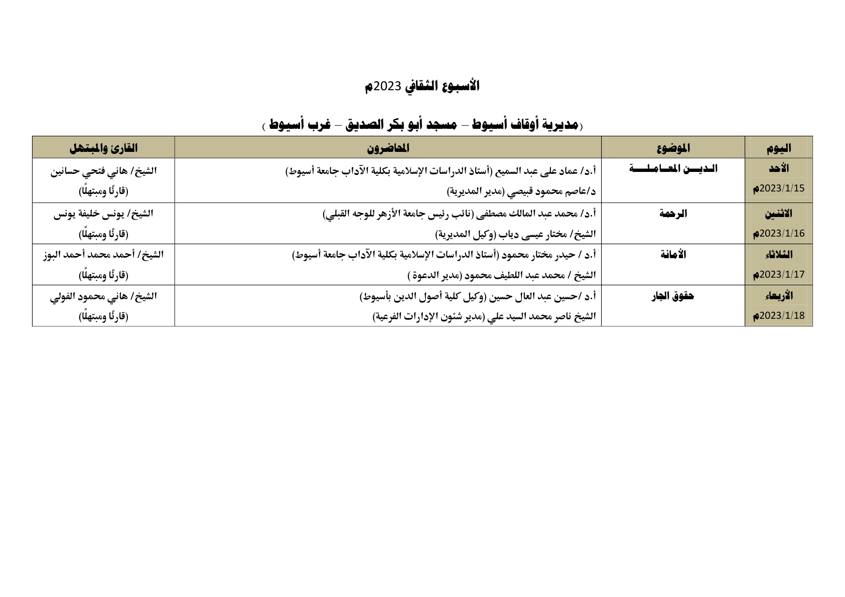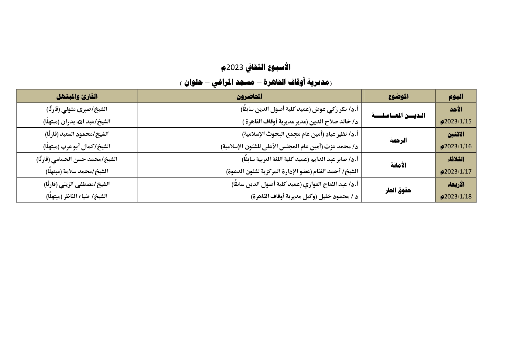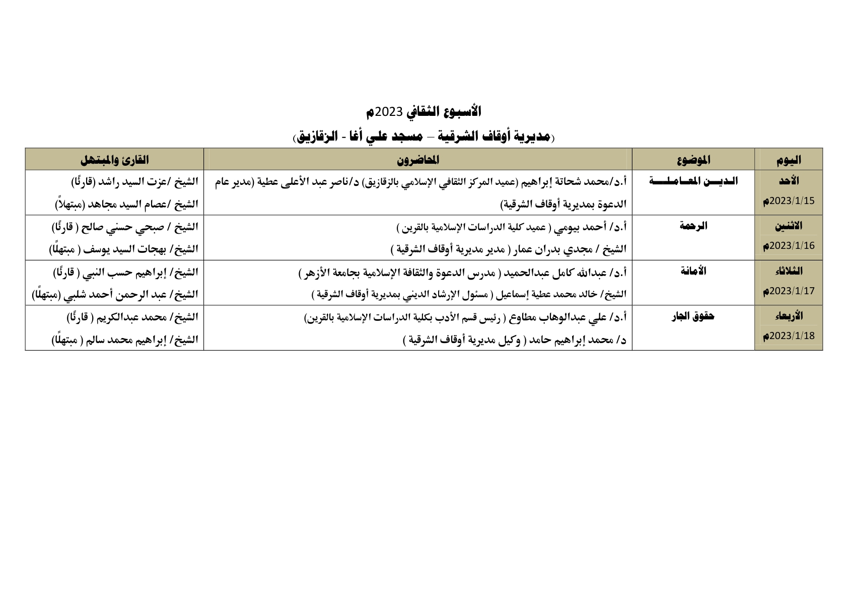 في ضوء الدور التثقيفي الذي تقوم به وزارة الأوقاف ، يُقام الأسبوع الثقافي في اثنتي عشرة محافظة في وقت واحد وهي: (القاهرة ، الإسكندرية ، كفر الشيخ ، الشرقية ، الغربية ، قنا ، أسيوط ، دمياط، الفيوم ، بني سويف ، السويس ، الوادي الجديد) ، وذلك خلال الأسبوع القادم من الأحد 15/ 1/ 2023م حتى الأربعاء 18/ 1/ 2023م ، علمًا بأن محاضرات الأسبوع الثقافي تُعقد بعد صلاة العشاء مباشرة ، بمشاركة نخبة من كبار العلماء والأئمة المتميزين مع نخبة من كبار القراء والمبتهلين ، وذلك على النحو التالي :