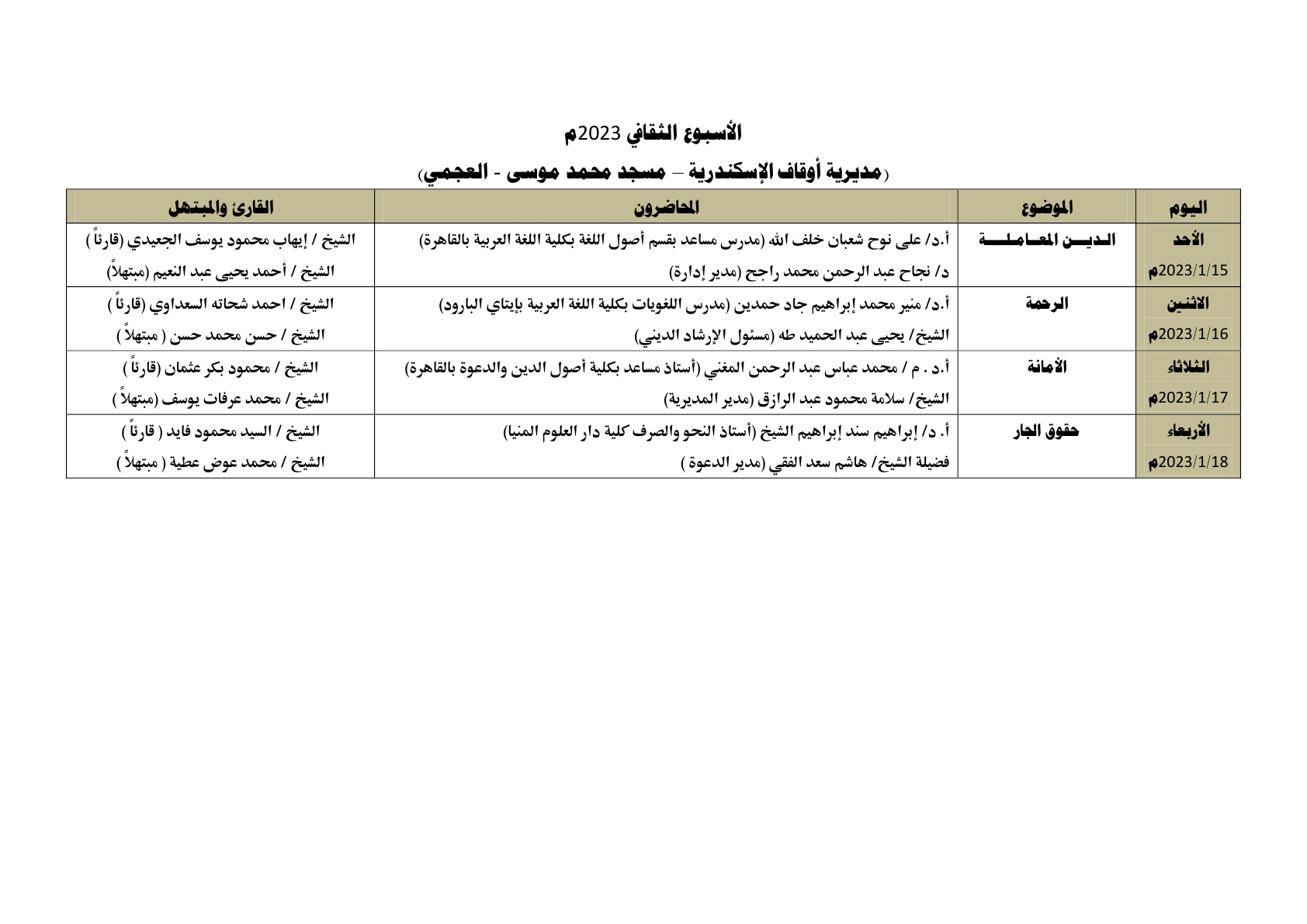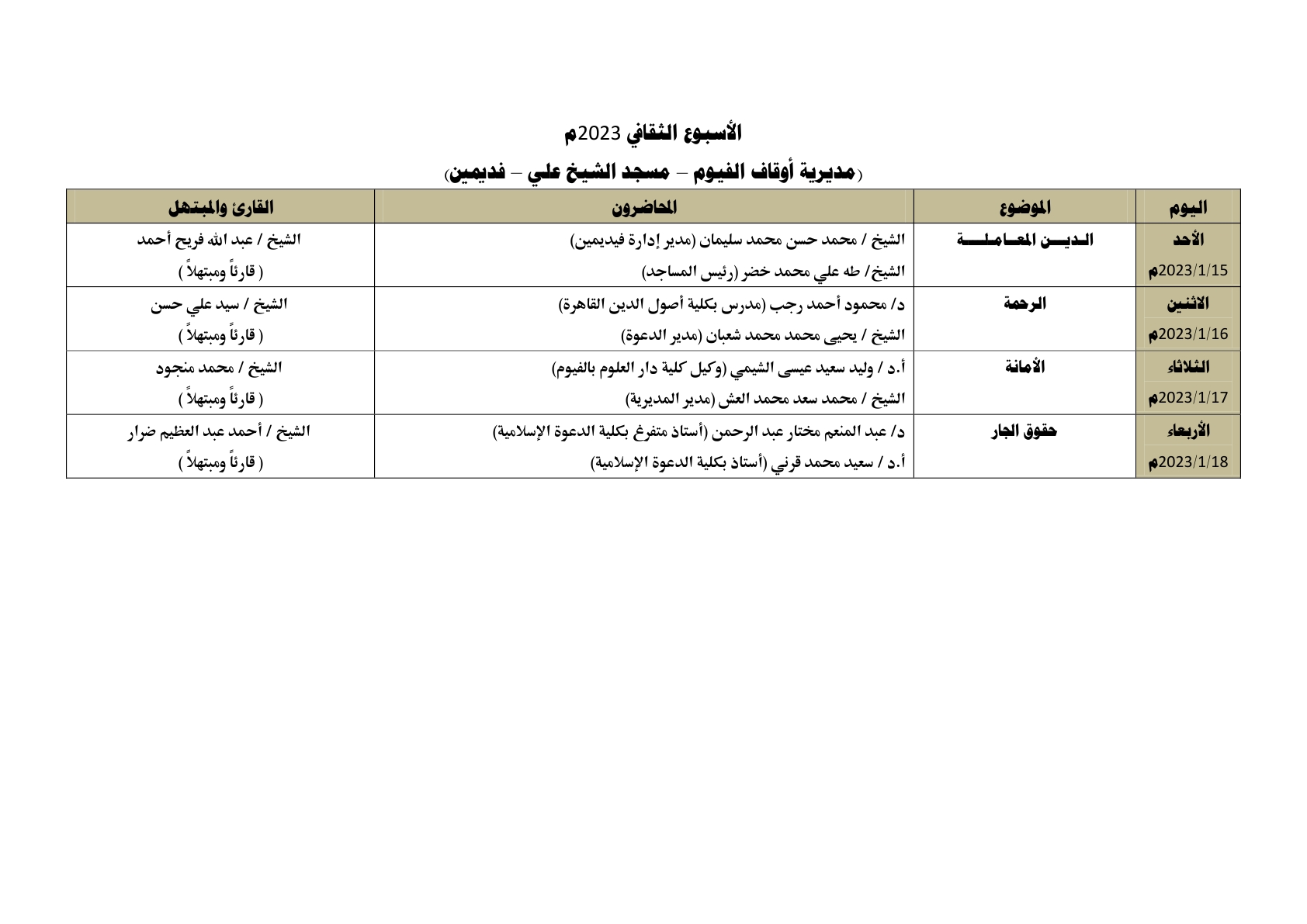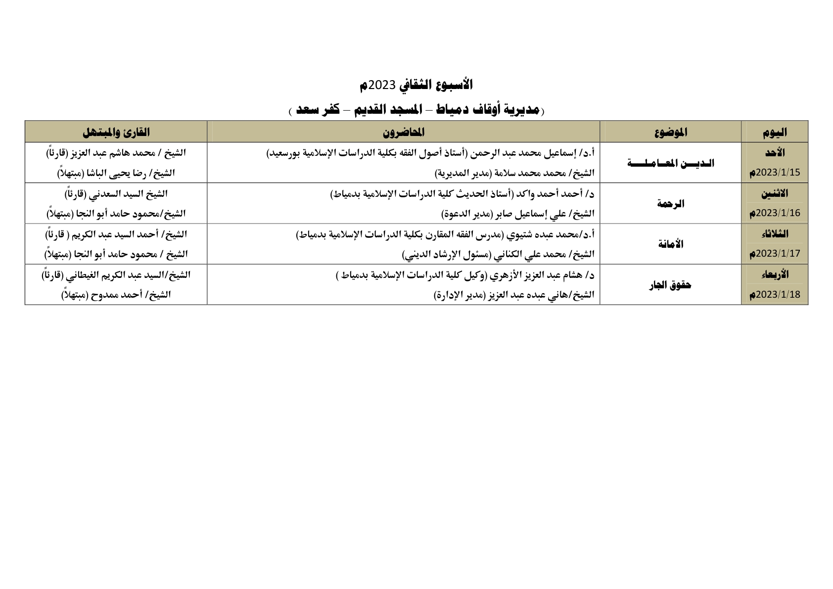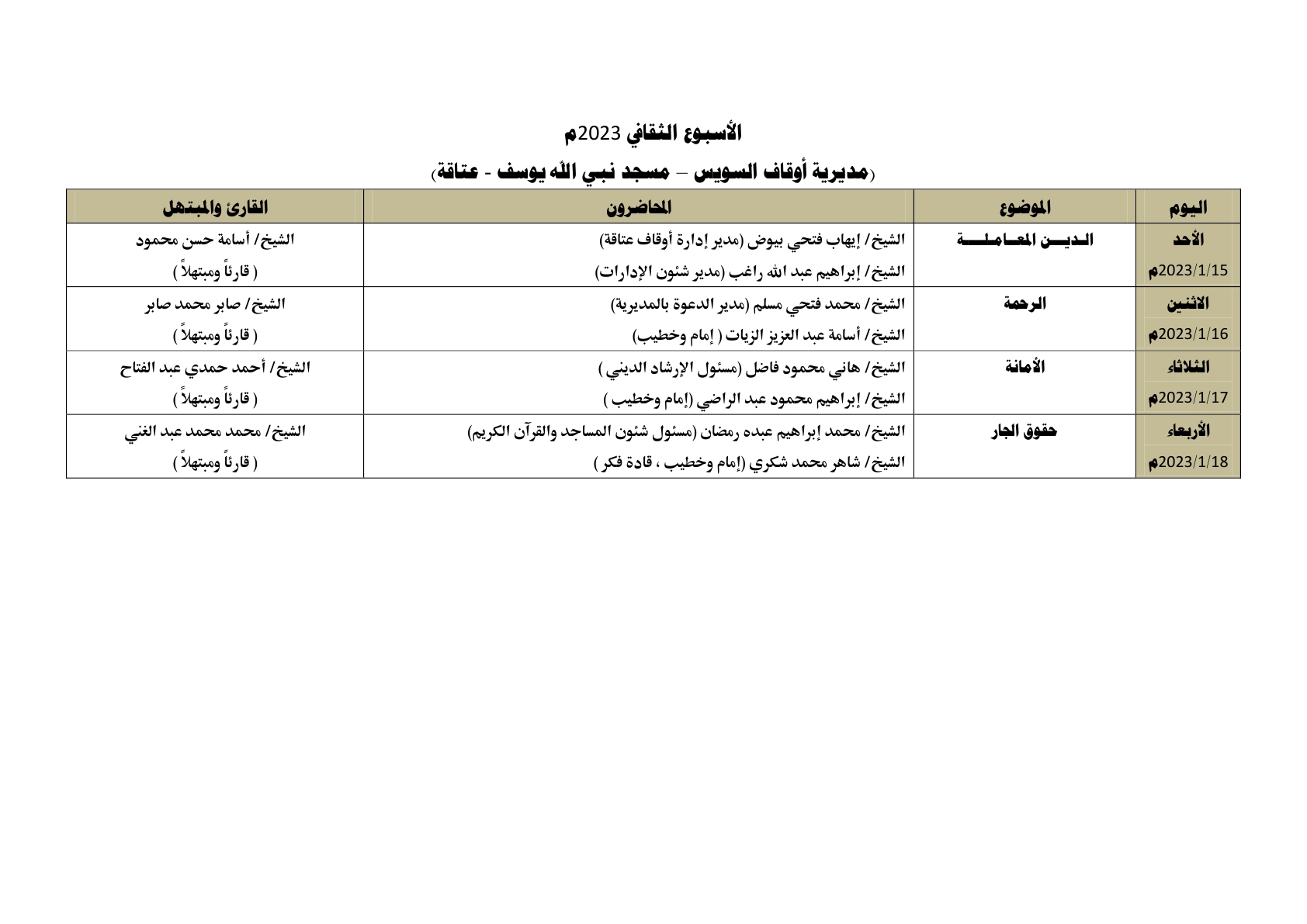 في ضوء الدور التثقيفي الذي تقوم به وزارة الأوقاف ، يُقام الأسبوع الثقافي في اثنتي عشرة محافظة في وقت واحد وهي: (القاهرة ، الإسكندرية ، كفر الشيخ ، الشرقية ، الغربية ، قنا ، أسيوط ، دمياط، الفيوم ، بني سويف ، السويس ، الوادي الجديد) ، وذلك خلال الأسبوع القادم من الأحد 15/ 1/ 2023م حتى الأربعاء 18/ 1/ 2023م ، علمًا بأن محاضرات الأسبوع الثقافي تُعقد بعد صلاة العشاء مباشرة ، بمشاركة نخبة من كبار العلماء والأئمة المتميزين مع نخبة من كبار القراء والمبتهلين ، وذلك على النحو التالي :
