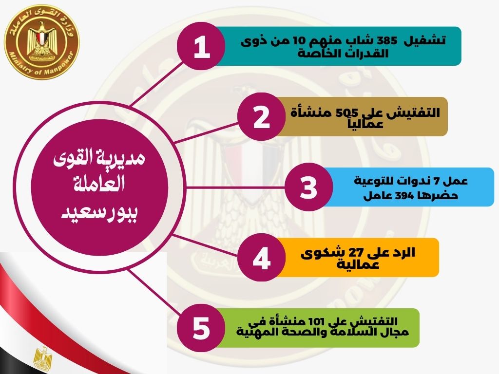 والتقرير الثالث قال فيه عبد الونيس عبد الله مدير مديرية القوى العاملة ببورسعيد ، انه تم تشغيل 385 شاب منهم 10 من ذوى القدرات الخاصة وتوفير 95 فرصة عمل ، و استخراج 822 شهادة قياس مستوى مهارة وكارنيه مزاولة حرفة ، و التفتيش على 505 منشأة عمالياً واسفر عن تحرير 40 محضراً ، ووعمل 7 ندوات للتوعية حضرها 394 شخص ، والتفتيش على 101 منشأة فى مجال السلامة والصحة المهنية واسفر عن تحرير 17 محضراً للمنشآت المخالفة ، والرد على 27 شكوى عمالية .