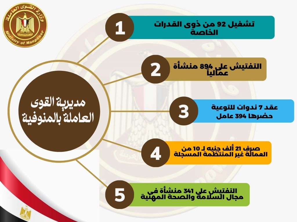 وعن التقرير الثالث قال سعد عبد الحميد مدير مديرية القوى العاملة بالمنوفية ، انه تم تشغيل 92 شاب منهم ذوى القدرات الخاصة ، و استخراج 2552 شهادة قياس مستوى مهارة وكارنيه مزاولة حرفة ، و التفتيش على 894 منشأة عمالياً واسفر عن تحرير 80 محضراً ، وصرف 21 ألف جنيه لـ 10 من العمالة غير المنتظمة المسجلة بالمديرية لرعايتهم إجتماعياً وصحياً ، فضلاً عن التفتيش على 341 منشأة فى مجال السلامة والصحة المهنية واسفر عن تحرير 14 محضراً و309 إنذار للمنشآت المخالفة .