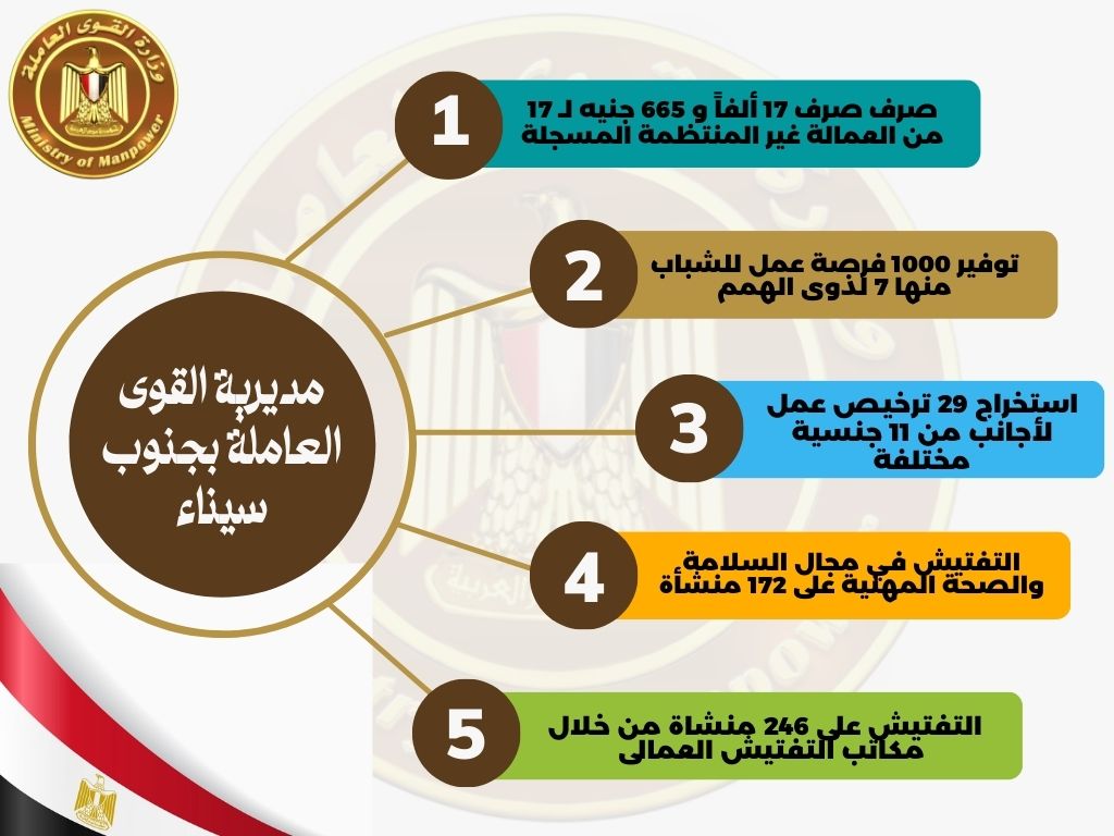 وفي التقرير الثانى ، نوه فيه اشرف علم الدين مدير مديرية القوى العاملة بجنوب سيناء ، إلى أن المديرية استطاعت خلال الشهر توفير 1000 فرصة عمل للشباب منها 7 لذوى الهمم ، والتفتيش على 246 منشاة بنظام الدورى والحملات ،وبحث 6 شكاوى عمالية ، وعقد 2 ندوة توعية ، وكذلك التفتيش في مجال السلامة والصحة المهنية على 172 منشأة اسفر عن تحرير 46 محضراً لمنشآت مخالفة ، فضلاً عن صرف 17 ألفاً و 665 جنيه لـ 17 عامل من العمالة غير المنتظمة المسجلة بالمديرية لرعايتهم إجتماعياً وصحياً ، فضلاً عن استخراج 29 ترخيص عمل لأجانب من 11 جنسية مختلفة يعملون داخل المحافظة .