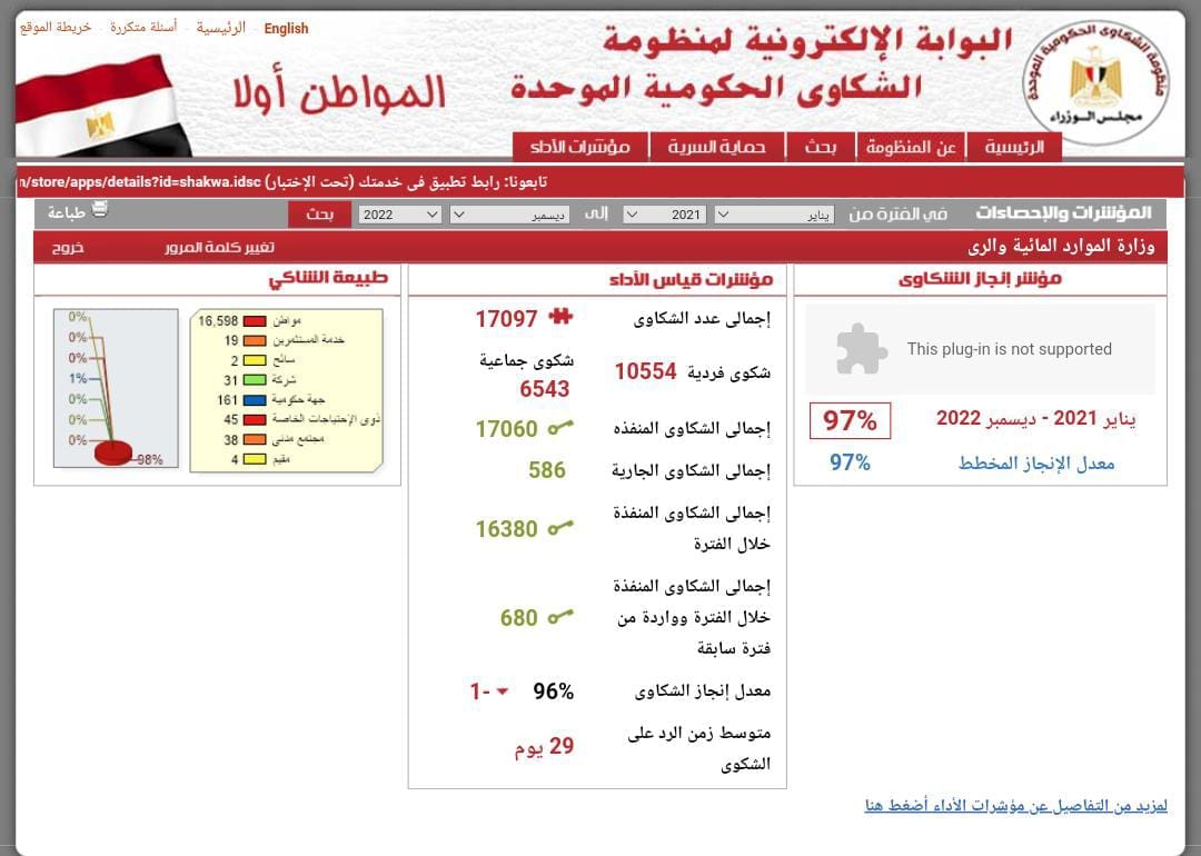 - ٩٧ % نسبة تنفيذ الشكاوى من يناير ٢٠٢١ حتى ديسمبر ٢٠٢٢ طبقاً لمؤشر منظومة الشكاوى الحكومية الموحدة بمجلس الوزراء
