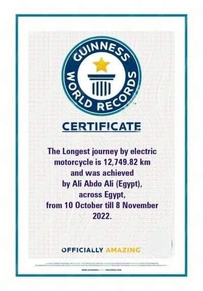 وقد تحقق الرقم الأول للمغامر المصري بتسجيله "أطول رحلة على دراجة كهربائية داخل دولة"، وذلك بعد أن قطع مسافة 9,759 كيلو خلال 22 يوما من انطلاق الرحلة، وهو رقم قياسي جديد أول مرة يتم تسجيله في موسوعة جينيس للأرقام القياسية.