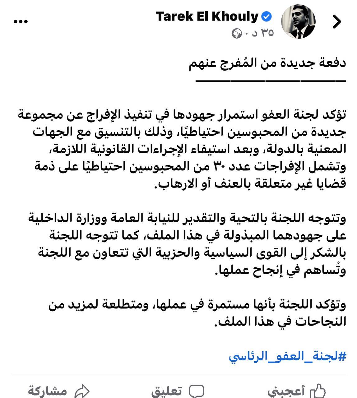 وأوضح «الخولي» عبر صفحته الرسمية على موقع التواصل الاجتماعي فيس بوك، منذ قليل، أن لجنة العفو أكدت استمرار جهودها في تنفيذ الإفراج عن مجموعة جديدة من المحبوسين احتياطيًا، وذلك بالتنسيق مع الجهات المعنية بالدولة، وبعد استيفاء الإجراءات القانونية اللازمة، وتشمل الإفراجات 30 من المحبوسين احتياطيًا على ذمة قضايا غير متعلقة بالعنف أو الإرهاب.