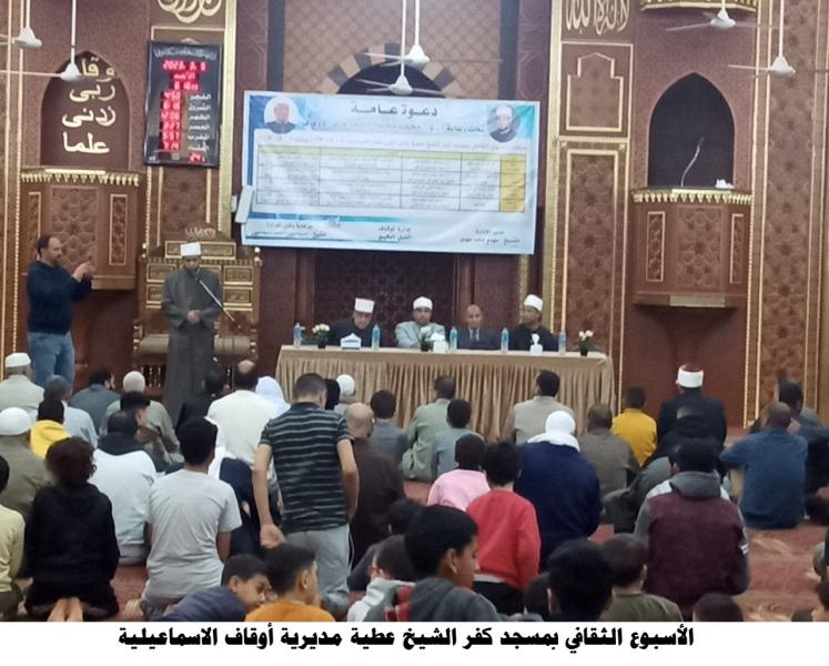 وفي مديرية أوقاف الإسماعيلية أقيم الأسبوع الثقافي بمسجد كفر الشيخ عطيه، حاضر فيه أ.د/ رجب أحمد عبد الحميد عودة أستاذ أصول اللغة المساعد بجامعة الأزهر، والدكتور/ محمد عبد المعبود مدير الدعوة، وقدم له الشيخ/ محمود النجار إمام وخطيب المسجد، والقارئ الشيخ/ حسن منصور قارئًا، والمبتهل الشيخ/ محمد عبدالعظيم مبتهلًا، بحضور الشيخ/ مهدي حامد مدير إدارة أوقاف التل الكبير، وجمع غفير من رواد المسجد.