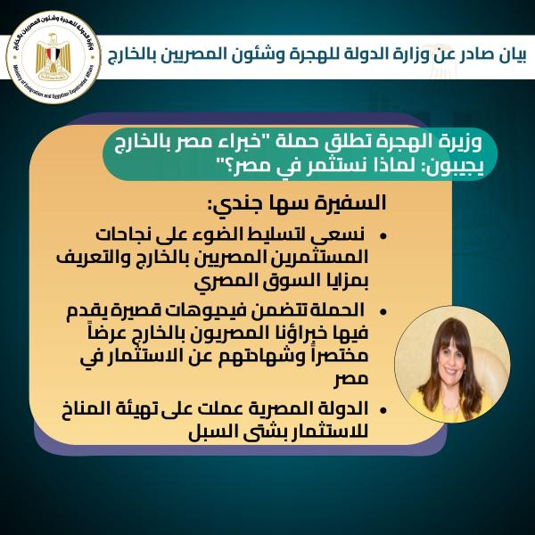 أعلنت السفيرة سها جندي، وزيرة الدولة للهجرة وشئون المصريين بالخارج، عن إطلاق حملة توعوية تحت عنوان: "خبراء مصر بالخارج يجيبون: لماذا نستثمر في مصر؟"، وذلك في إطار دور وزارة الهجرة في الترويج للدولة المصرية وإنجازاتها وتحفيز جهود الاستثمار ضمن استراتيجية وزارة الهجرة للتواصل مع المستثمرين بالخارج.