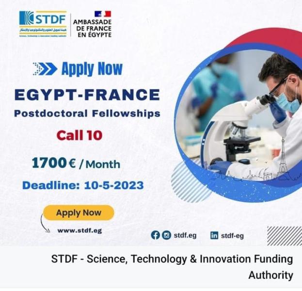أعلنت هيئة تمويل العلوم والتكنولوجيا والابتكار (STDF) عن فتح باب التقدم لبرنامج التعاون المصري الفرنسي، منحة ما بعد الدكتوراه ( الدورة العاشرة)، وذلك للتدريب العملي بمعامل فرنسا، والتعاون البحثي المشترك لمدة 6 أشهر، بدعم 1700 يورو شهريًا.