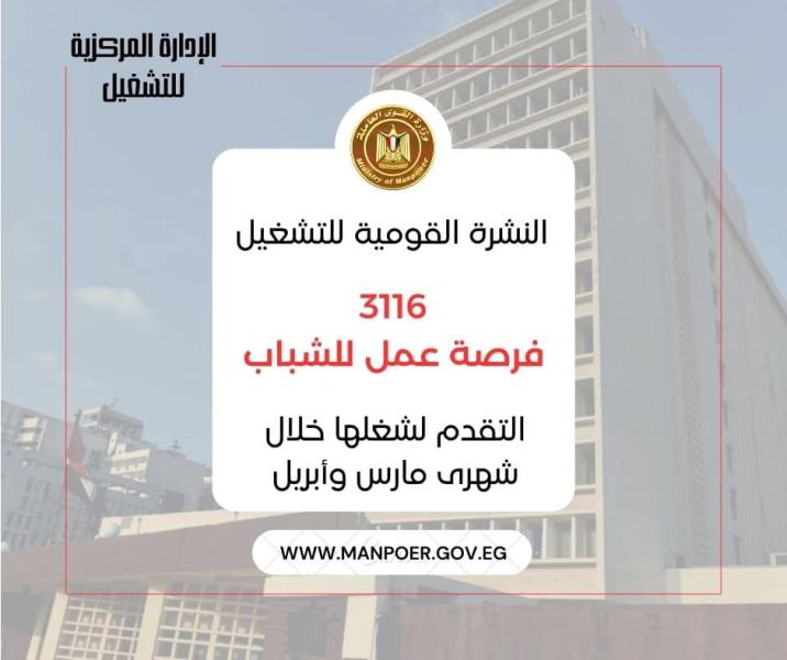 وجاء في البيان الصحفي ،أن نشرة التوظيف الدورية تصدر عن "الوزارة" كل 15 يوم، من خلال الإدارة العامة للتشغيل برئاسة هبه أحمد مدير عام التشغيل بالوزارة، وتعدها منى شوقي باحث أول بالإدارة، تعلن اليوم عن فرص عمل جديدة ،متوفرة في 11 محافظة، هي: القاهرة ، وبورسعيد ، وأسيوط ، والإسكندرية ، والغربية، والمنوفية ، والشرقية، والإسماعيلية ، وأسيوط ، والدقهلية ، وجنوب سيناء، في التخصصات الاتية : مهندسين زراعة وميكانيكا وكهرباء ونسيج ، ومحاسبين ، ومدرسين فيزياء وأحياء ورياضيات ولغة عربية وإنجليزية ، ومندوبين مبيعات ، وشؤون عاملين ، ومشرفين جودة ، وفنيين جميع التخصصات ، وعمال إنتاج ، وأفراد أمن بمواقع مميزة ، وأخصائيين تمويل ، ومعلمين سباحة ، ومترجمين لغة صينية ، ومحاضرين برمجة وحاسب آلي ولغة ألمانية ، وكافة التخصصات الفندقية ، ومهن التفصيل والخياطة ، وسائقين ، وعمال نظافة وتجميع وخدمات ،وتخصصات أخرى .