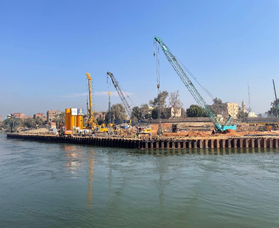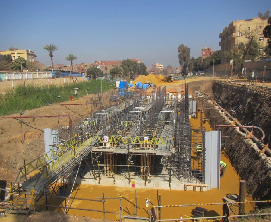 - نهو الأساسات الخرسانية المسلحة لقنطرة الديروطية والعمل في صب أكتاف القنطرة