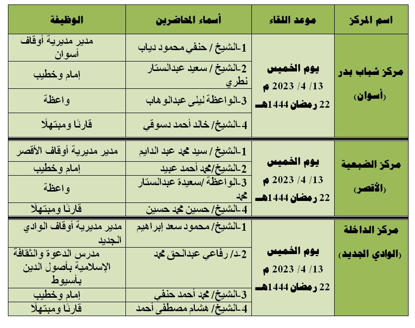 1- مركز شباب (بدر) بمحافظة أسوان (يوم الخميس 13 / 4 / 2023 – الموافق 22 رمضان 1444هــ).
