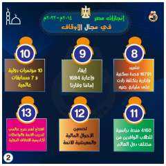 6. تم فرش (1149) مسجدًا، بكمية فرش بلغت (335371) مترًا من السجاد (المحراب) الذي ينتجه مصنع سجاد دمنهور المملوك لهيئة الأوقاف المصرية، بتكلفة بلغت (68,584,950) جنيهًا.