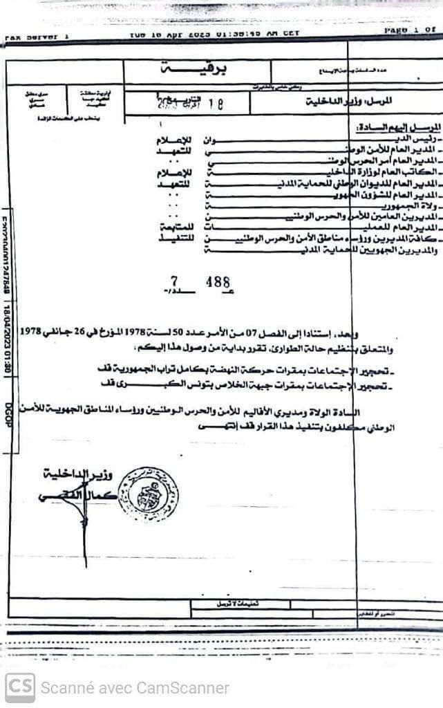 أصدر وزير الداخلية التونسي، كمال الفقي، قرارا بمنع الاجتماعات بمقرات حركة “النهضة” بكامل الأراضي التونسية وفي مقرات “جبهة الخلاص الوطني”، وذلك استنادا إلى القانون المتعلق بحالة الطوارئ.