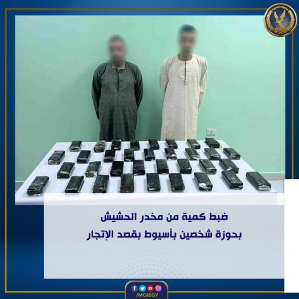 تمكن قطاع الأمن العام بمشاركة مديرية أمن أسيوط من ضبط (شخصين ) حال إستقلالهما سيارة ملاكى قيادة أحدهما قادمان من طريق "القاهرة / الغردقة" وبحوزتهما (كمية من مخدر الحشيش وزنت 17 كيلو جرام مخبأ داخل حقيبة السيارة – 2 هاتف محمول).