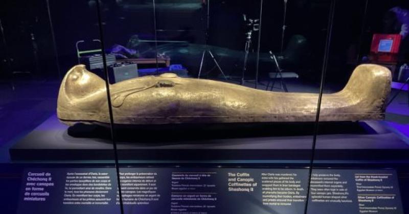 ومن بين الكنوز المعروضة "التابوت الملكي" الذي له مكانة كبيرة ومصنوع من خشب الأرز ومطلي باللون الأصفر ويمثل "الملك بهيئة آدمية" والذي وافقت على نقله السلطات المصرية إلى فرنسا، بشكل استثنائي، لعرضه ضمن هذه القطع الفرعونية، تقديرا لجهود العلماء الفرنسيين الذين قاموا بمعالجة مومياء رمسيس الثاني من الفطريات عام 1976، كما يضم المعرض قطعا أثرية ثمينة، من بينها مجوهرات من الذهب والفضة والتماثيل والتمائم، ويقدم للزوار أيضا تجربة غامرة للتجول في معابد أبو سمبل واستكشاف قبر الملكة نفرتاري عبر تقنية "الواقع الافتراضي".