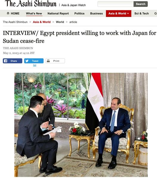 أجرى الرئيس عبد الفتاح السيسي حواراً صحفياً مع رئيس التحرير الدولي لصحيفة "أساهي"، إحدى أكبر الصحف اليابانية وأعرقها، وذلك على هامش زيارة رئيس وزراء اليابان "فوميو كيشيدا" لمصر خلال الفترة من 29 أبريل إلى الأول من مايو الجاري.