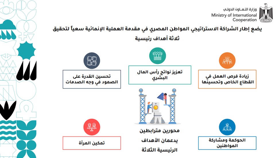 ويضع إطار الشراكة الاستراتيجي المواطن المصري في مقدمة العملية الإنمائية سعياً لتحقيق ثلاثة أهداف رئيسية هي (1) زيادة فرص العمل في القطاع الخاص وتحسينها، و(2) تعزيز الاستثمار في رأس المال البشري، و (3) تحسين القدرة على الصمود في وجه الصدمات، إلى جانب محورين مترابطين يدعمان الأهداف الرئيسية الثلاثة هما الحوكمة وتعزيز مشاركة المواطنين وتمكين المرأة.