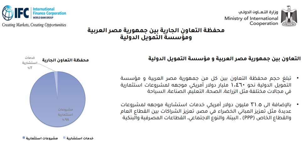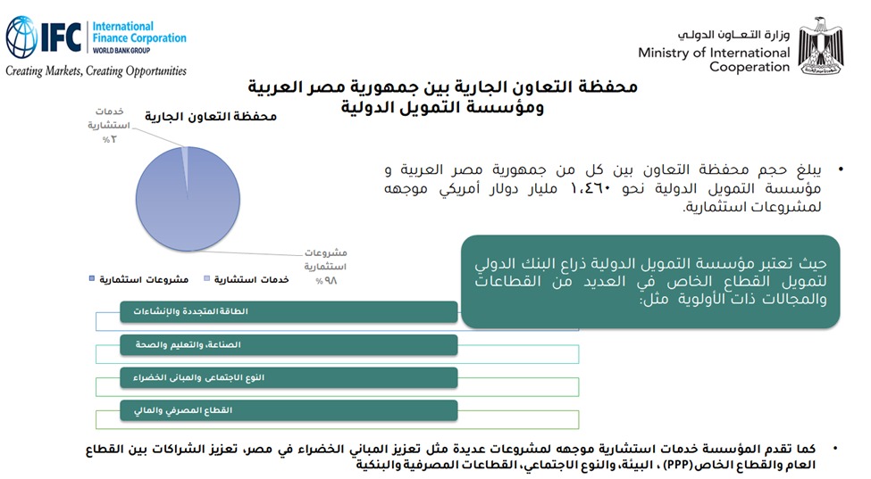 اتساقًا مع رؤية الدولة وجهود تمكين القطاع الخاص وتوسيع قاعدة مشاركته في تحقيق التنمية، يتم العمل مع المؤسسات التابعة لمجموعة البنك الدولي وهي مؤسسة التمويل الدولية IFC والوكالة الدولية لضمان الاستثمار MIGA، على تعزيز الاستثمارات للقطاع الخاص في مختلف مجالات التنمية ذات الأولوية وتعزيز التمويل الأخضر.