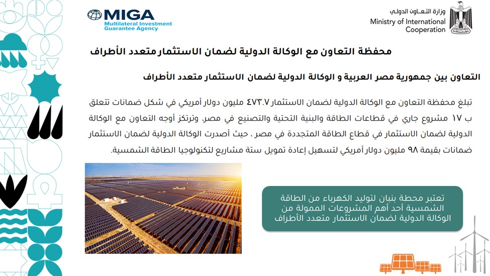 ومن خلال التعاون مع الوكالة الدولية لضمان الاستثمار MIGA، تم استثمار أكثر من 470 مليون دولار في شكل ضمانات لـ 17 مشروعًا جاريًا في قطاعات البنية التحتية والتصنيع والطاقة المتجددة، وتعتبر محطة بنبان للطاقة الشمسية من أهم المشروعات الممولة من الوكالة الدولية لضمان الاستثمار.