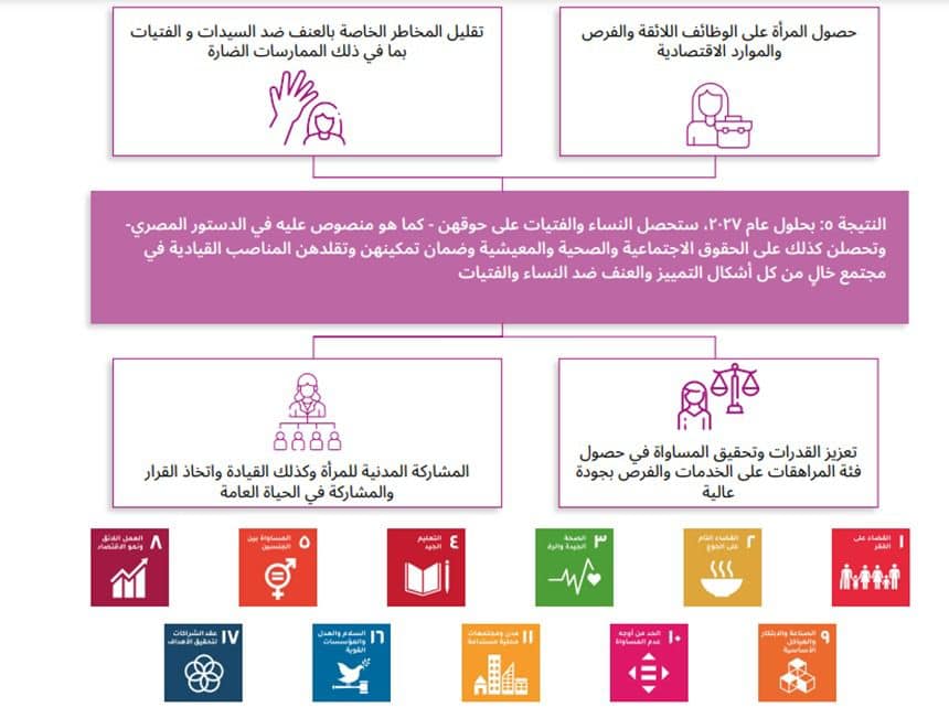 الناتــج الخامــس: بحلــول عــام ٢٠٢٧، تعزيز حصول النســاء والفتيــات علــى حقوقهــن - كمــا هــو منصــوص عليــه فــي الدسـتور المصـري- وكذلـك عـلى الحقـوق الاجتماعيـة والصحيـة والمعيشـية وضمـان تمكينهـن وتقلدهـن المناصب القيادية في مجتمع خال من كل أشكال التمييز والعنف ضد النساء والفتيات.