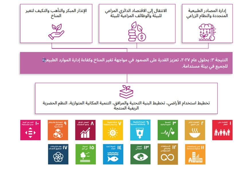 الناتــج الثالــث: بحلــول عــام ٢٠٢٧، تعزيــز القــدرة عــى الصمــود فــي مواجهــة تغيــر المنــاخ وكفــاءة إدارة المــوارد الطبيعية للجميع في بيئة مستدامة.