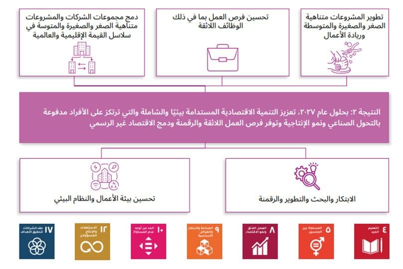 الناتـج الثانـي: بحلـول عـام ٢٠٢٧، تعزيـز التنميـة الاقتصاديـة المسـتدامة بيئيـا والشـاملة والتـي ترتكـز عـلى الأفـراد، مدفوعة بالتحول الصناعي ونمو الإنتاجية، وتوفر فرص العمل اللائقة والرقمنة ودمج الاقتصاد غير الرسمي.