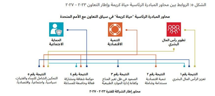 ومـن خلال الاسـتفادة مـن قـدرة منظومـة الأمـم المتحـدة علـى جمـع مختلـف الأطراف ذات الصلة وتقديـم المشـورة فـي وضـع برامـج السياسـات التنمويـة، وترويـج أفضـل الممارسـات الدوليـة، والدعـوة إلى عـدم تـرك أي أحـد خلـف الركــب، من المقرر أن تعمل الحكومة ومنظمة الأمم المتحدة علــى معالجــة التحديــات والمخاطــر الرئيســية لتسـريع وتيـرة تحقيـق أهـداف التنميـة المسـتدامة. وبالتالـي سـيكون لإطـار التعـاون خمـس نتائج تسهم في تحقيق الأولويات الاستراتيجية، على النحو التالي: