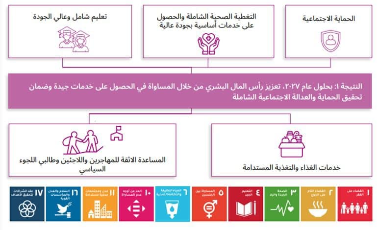الناتـج الأول: بحلـول عـام ٢٠٢٧، تعزيـز رأس المـال البشـري مـن خـلال المسـاواة فـي الحصـول علـى خدمـات جيـدة وضمان تحقيق الحماية والعدالة الاجتماعية الشاملة.