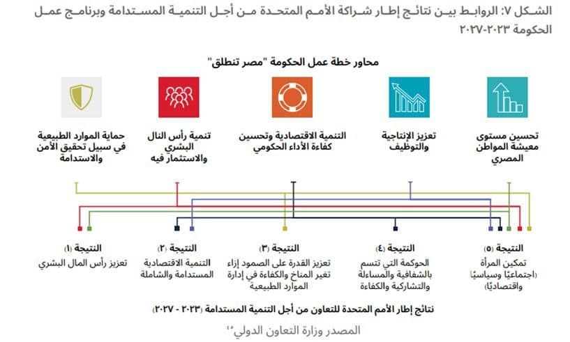 تُنفذ رؤية مصر 2030 من خلال برنامج عمل الحكومة "مصر تنطلق"، وتتسق الأولويات الخمسة لبرنامج عمل الحكومة 2023-2027 مع إطار التعاون من أجل التنمية المستدامة، ويهدف برنامج عمل الحكومة إلى تحسين المستوى المعيشي للمواطن المصري من خلال تحسين البنية التحتية، وتعزيز الإنتاجية والتوظيف، وتحقيق التنمية الاقتصادية ورفع كفاءة الأداء الحكومي، وتطوير رأس المال البشري والاستثمار فيه، وحماية الموارد الطبيعية من أجل الأمن والاستدامة.