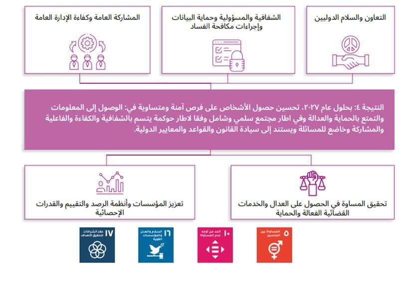 الناتــج الرابــع: بحلــول عــام ٢٠٢٧، تحســين حصــول الأشــخاص عـلـى فــرص آمنــة ومتســاوية فــي: الوصــول إلى المعلومـات والتمتـع بالحمايـة والعدالـة وفـي إطـار مجتمـع سـلمي وشـامل وفقـا لإطـار حوكمـة يتسـم بالشـفافية والكفاءة والفاعلية والمشاركة وخاضع للمسائلة ويستند إلى سيادة القانون والقواعد والمعايير الدولية.